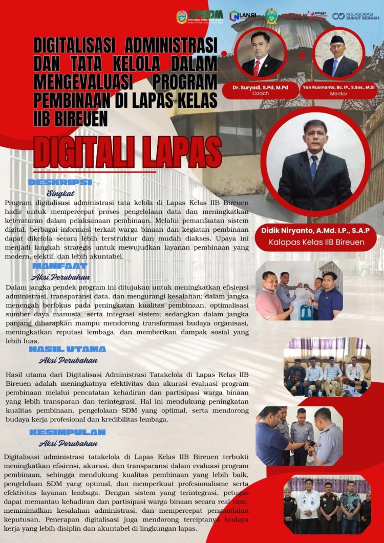 Kepala Lapas Kelas IIB Bireuen, Didik Niryanto, A.Md.I.P., S.A.P., dalam keterangannya menegaskan bahwa penerapan digitalisasi administrasi merupakan bagian dari modernisasi pemasyarakatan serta implementasi reformasi birokrasi yang digaungkan Kementerian Hukum dan HAM.