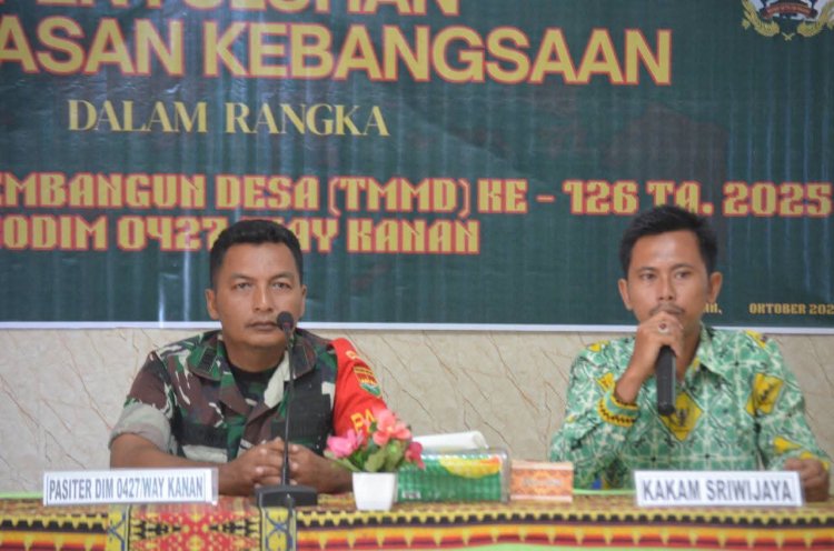 Metro Nusantara News - Way Kanan, 10 Oktober 2025 – Kodim 0427/Way Kanan melaksanakan kegiatan penyuluhan Wawasan Kebangsaan sebagai bagian dari program non-fisik TNI Manunggal Membangun Desa (TMMD) ke-126 Tahun 2025. Kegiatan ini berlangsung di Balai Kampung Sriwijaya pada hari Jumat, 10 Oktober 2025, dan dihadiri oleh 40 orang warga masyarakat setempat.