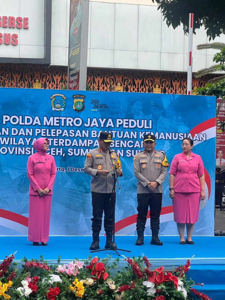 Kabidhumas Polda Metro Jaya Kombes Pol Budi Hermanto menyampaikan bahwa bantuan disalurkan secara bertahap ke tiga provinsi secara simbolis. Bantuan untuk Provinsi Aceh diserahkan oleh Ketua Bhayangkari Daerah Metro Jaya, kemudian bantuan ke Sumut diserahkan langsung oleh Kapolda Metro Jaya, dan bantuan untuk Sumbar oleh Wakapolda Metro Jaya. Kapolda juga mengajak seluruh pihak untuk turut mendoakan warga terdampak agar diberi kekuatan dalam menghadapi musibah.