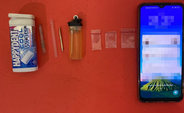 Dalam perkara ini barang bukti yang berhasil diamankan petugas, berupa kotak permen karet yang di dalamnya terdapat plastik klip berukuran 3,5x2,5 cm bekas sisa pakai, plastik klip berukuran 3x2 cm bekas sisa pakai, sedotan berbentuk skop, jarum, korek api gas dan Handphone merek Oppo A38 warna glowing gold.